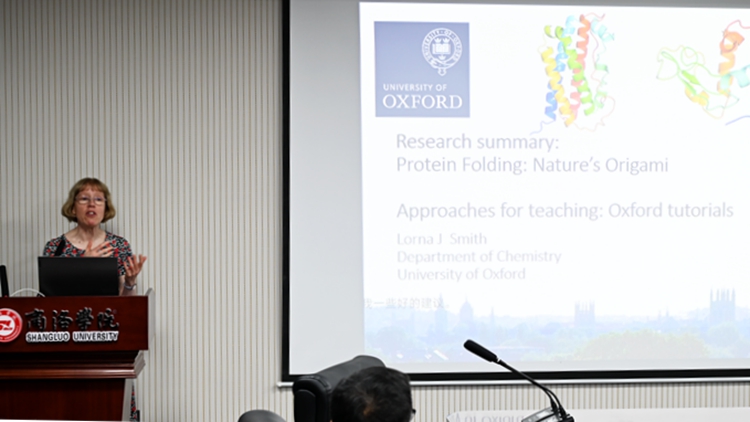 7月25日下午,牛津大学化学系教授Lorna J Smith应邀来校交流访问并为威尼斯师生作题为《蛋白质折叠:大自然的折纸艺术》的学术报告。校党委委员、科技处处长程敏,国际合作与交流处处长张建芳,化材学院、生物学院和健康管理学院相关负责人以及相关专业师生代表参加报告会。