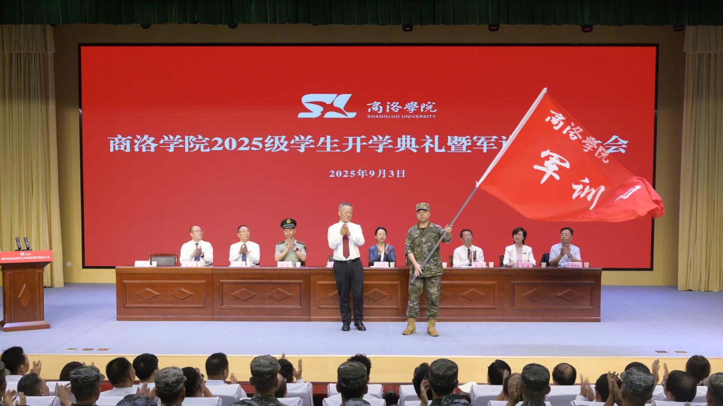 在热烈的掌声中,校党委书记张志昌向2025级新生军训团授团旗,新生军训团副团长、武警商洛支队参谋部少校副参谋长金星代表军训团接旗。