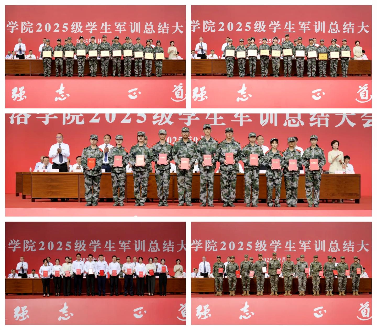与会领导分别为军事技能训练先进集体、军训内务整理先进集体、军训工作优秀教官、军训工作先进个人、军训优胜标兵代表颁发了奖牌和荣誉证书。