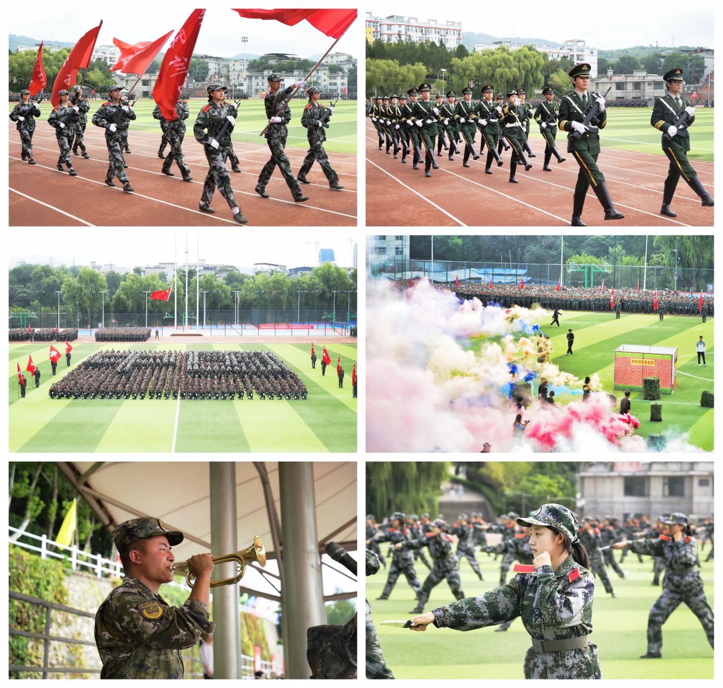 伴随着雄壮的《义勇军进行曲》,五星红旗冉冉升起,全体师生与承训官兵肃立注目,拉开了大会序幕。参训新生进行了分列式、花样队列、男子格斗拳、匕首操、反恐综合演练等5个训练科目的集中展示。分列式上,各个方阵穿着整齐、目光如炬,展现了学子们昂扬向上的精神风貌。花样队列用灵动的队形变换、默契的团队协作,在场上绽放青春光芒。男子格斗拳和匕首操气势磅礴、整齐划一,引来阵阵喝彩。反恐综合演练中,同学们全副武装、斗志昂扬,在模拟场景中成功完成了武力突击、人质解救等科目,用过硬的军事技能和高效的团队协作,生动诠释了“生命至上”的救援理念。
