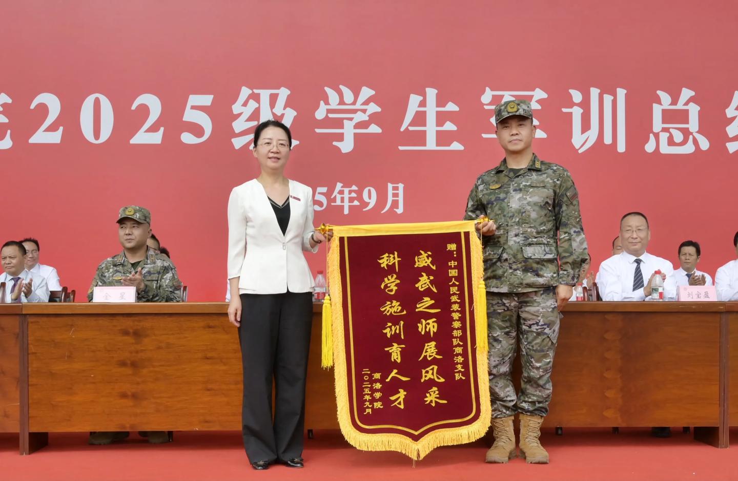权雅宁在讲话中代表学校向中国人民武装警察部队商洛支队表示感谢并向支队赠送锦旗。
