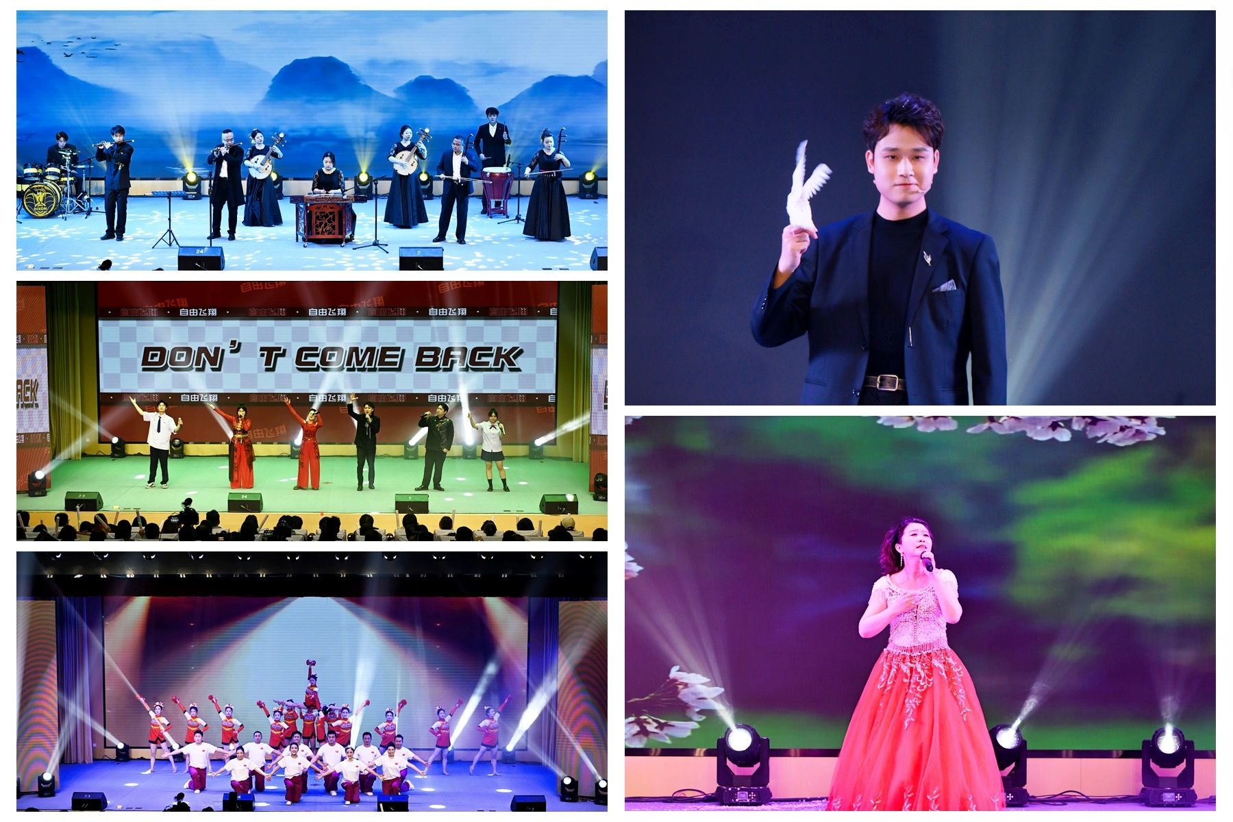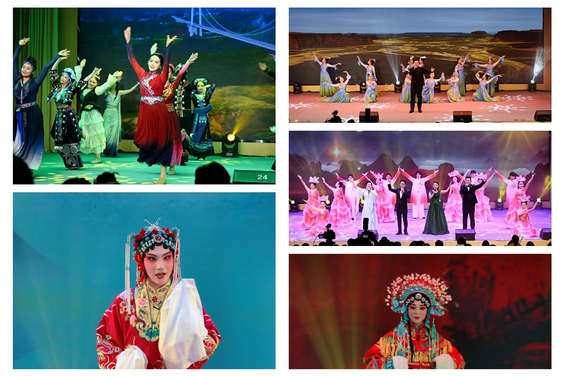 第三篇章“逐光而上·赴新程”激昂奏响奋进号角。歌伴舞《雪白的鸽子》寄托美好期盼;特邀专业演员与艺术学院合作的戏曲《盛世霓裳》华美亮相,国粹生香;大型民族舞蹈《民族欢歌》场面恢弘,舞出了团结奋进的磅礴气势;艺术学院倾力打造的歌伴舞《春风十万里》,以壮丽的画面与恢弘的歌声,描绘出国家昌盛、万象更新的动人画卷。