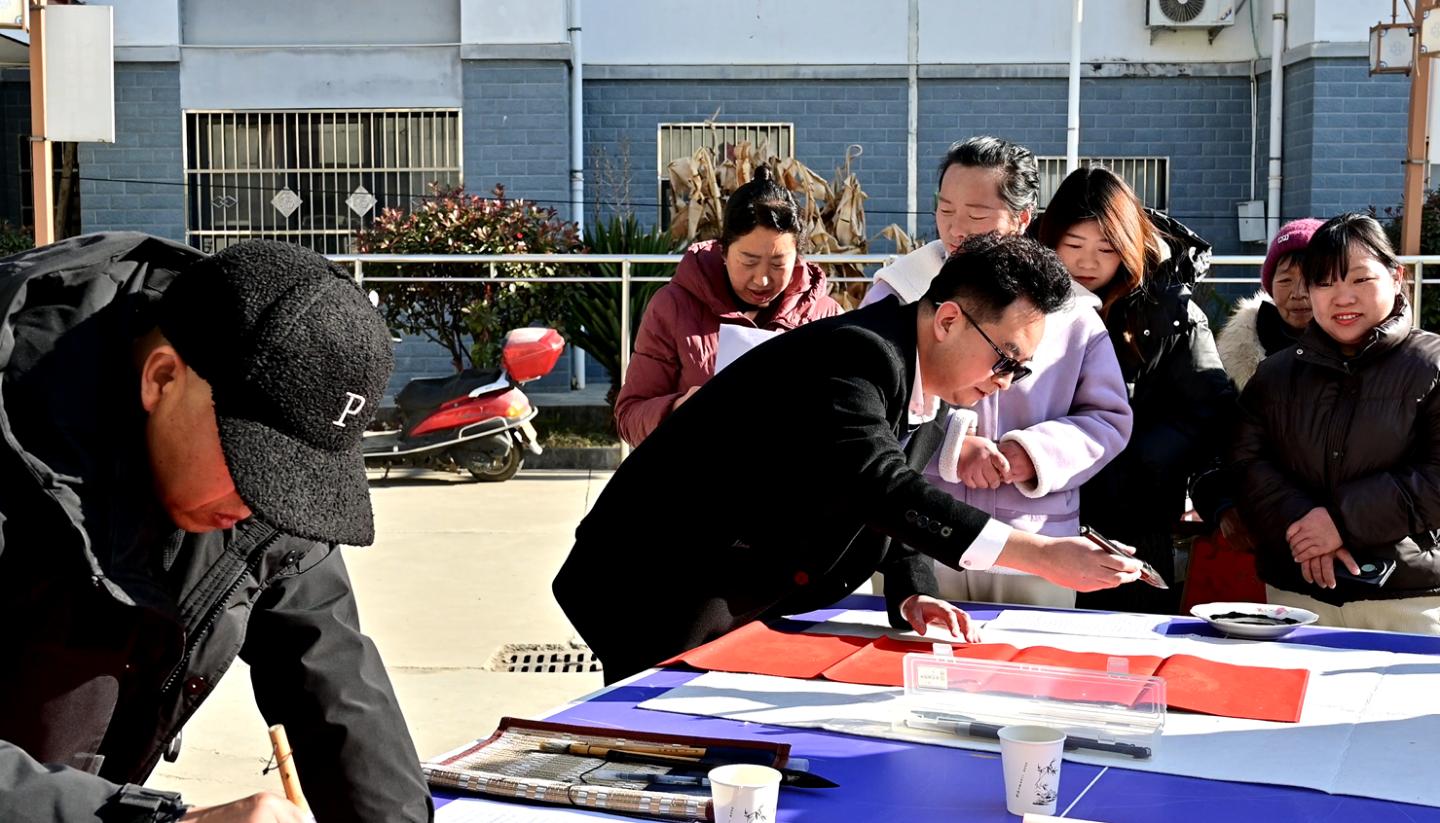 会后,权雅宁一行在县镇村干部陪同下,走访慰问村民家庭,详细了解他们的生产生活状况,并送去新春祝福与慰问品。与此同时,艺术学院教师在村委会广场现场挥毫,为村民书写春联,送去浓浓年味与文化温暖。