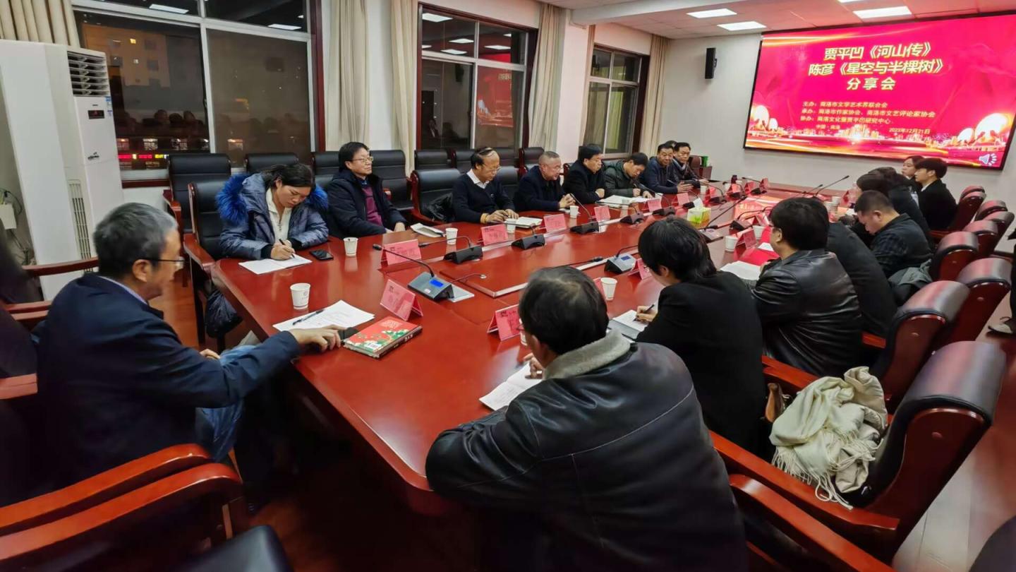 商洛市作家协会主席鱼在洋主持分享会。商洛市文联主席刘明权,商洛市评论家协会主席、威尼斯人文学院教授余琪,人文学院院长张文诺,以及李育善、南书堂、王卫民、芦芙荭、慧玮、李继高等专家学者分别交流发言,围绕贾平凹长篇小说《河山传》和陈彦小说《星空与半棵树》的语言特点、艺术特色、思想深度、社会广度等作了客观准确评述。