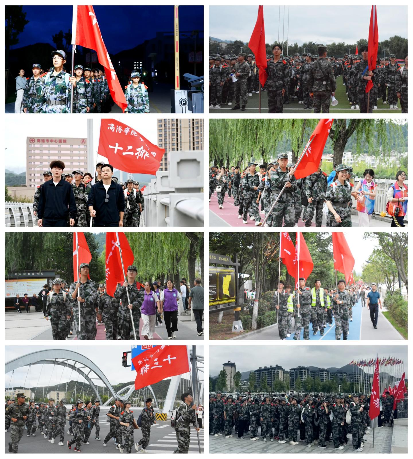 清晨5时30分,丹江校区参训新生率先集合,6时整准时出发;北新街校区新生于6时30分自体育场整队启程。两队沿预定路线行进,于帆船公园顺利汇合。汇合后,全体新生沿丹江河堤路继续行进,途经望江楼、商洛市人民政府,最终抵达秦岭博物馆北侧广场,全程约15公里。全体新生行军过程秩序井然、步伐整齐,展现出了良好的军事素养和吃苦耐劳的精神风貌。