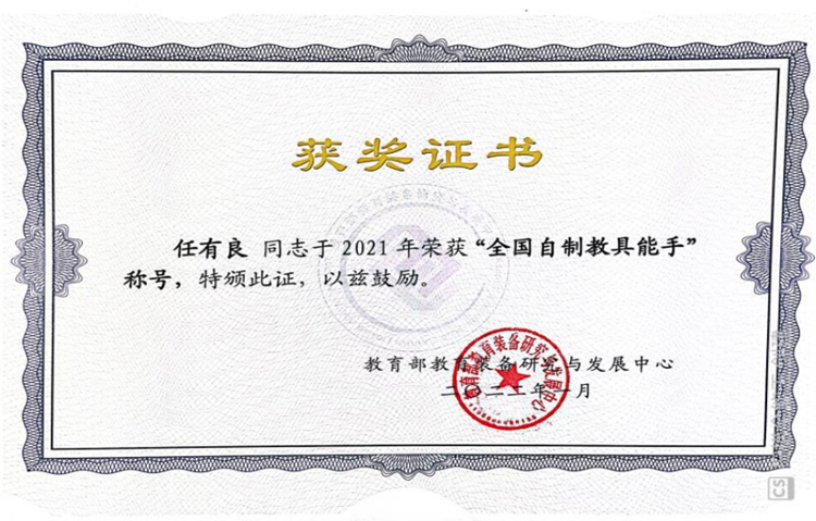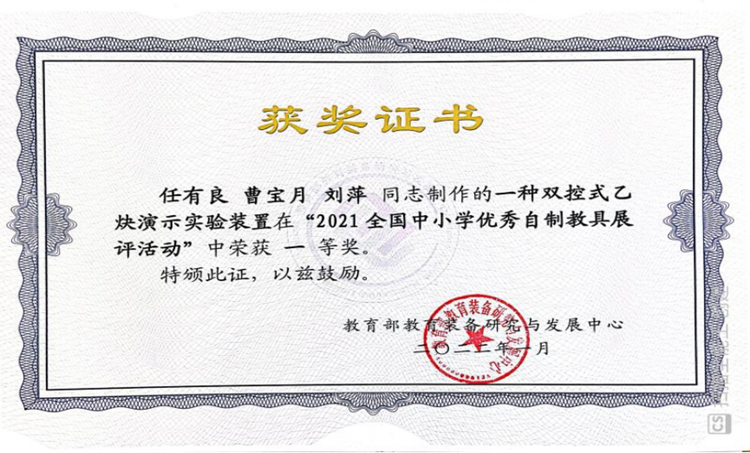 近日,教育部教育装备研究与发展中心举办了“2021全国中小学优秀自制教具展评活动”,威尼斯化学工程与现代材料学院教师任有良、曹宝月、刘萍的参展作品“一种双控式乙炔演示实验装置”获全国一等奖,任有良获“全国自制教具能手”称号。