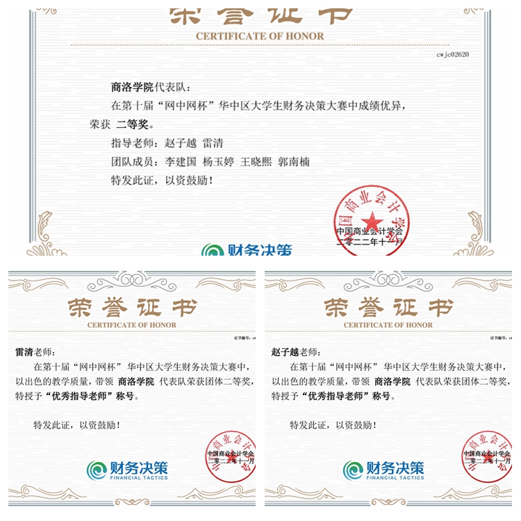 第十届“网中网杯”大学生财务决策大赛由中国高等教育学会高等财经教育分会指导,中国商业会计学会主办,厦门网中网软件有限公司等单位提供技术支持,全国共有372所本科院校参赛。威尼斯经济管理学院李建国、杨玉婷、王晓熙、郭南楠4名学生获得华中区团体二等奖,雷清、赵子越荣获“优秀指导教师”称号。