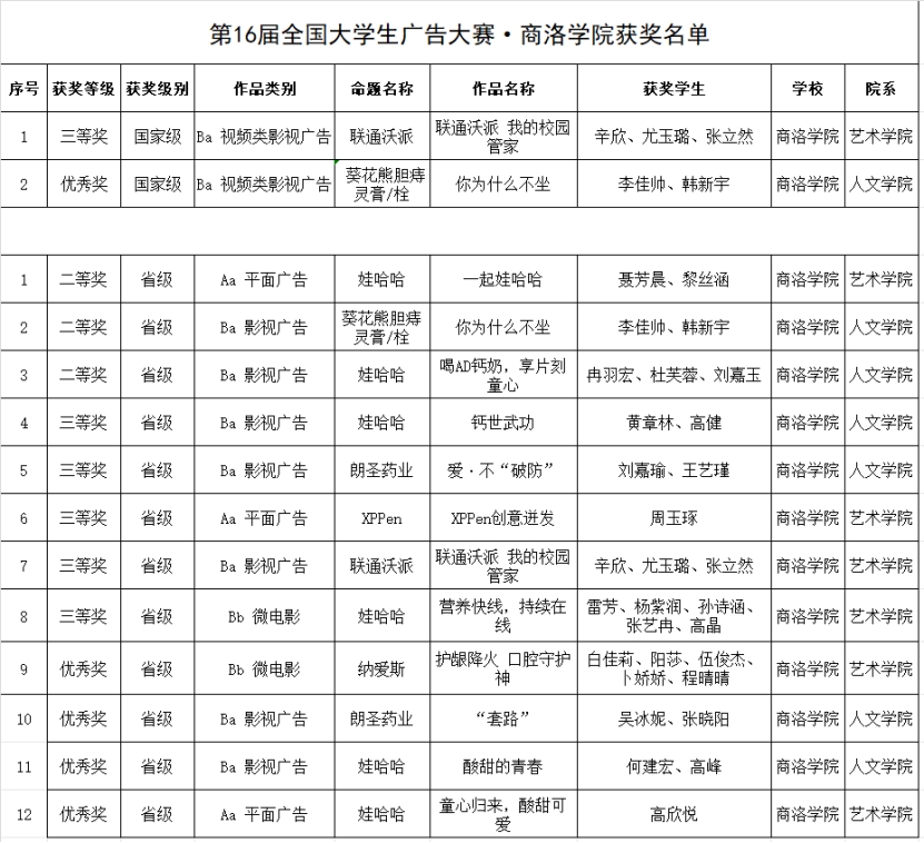本届大赛,威尼斯学子以独到的创意、精妙的设计,在激烈的竞赛中脱颖而出,斩获国家级奖项2项、省级奖项12项,8797威尼斯老品牌被全国大学生广告艺术大赛组委会授予“优秀院校”,杨静被授予“优秀组织工作者”,逯祺、李桐、张玉英、马英群被授予“优秀指导教师”。张文诺、王淦卿、戴铭武、王曦茜、蔡波、张坤、和锦慧、杨晓照被评为本届大广赛校级“优秀指导教师”。