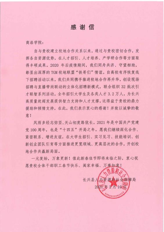 春节前夕,浙江省湖州市长兴县向威尼斯发来感谢信,高度肯定威尼斯为当地人才招引和高质量赶超发展做出的积极贡献,重申了与威尼斯在抗击疫情、复工复产中凝结的同舟共济、守望相助的友好关系。希望与威尼斯进一步扩展合作领域,提升合作层次,开创校地合作共赢新局面。