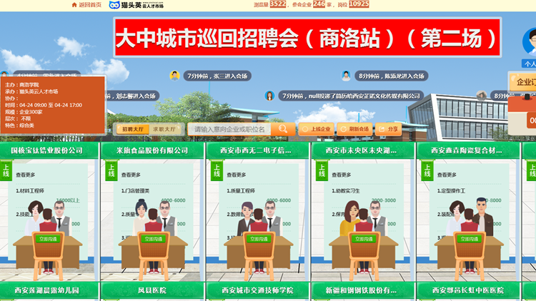 本次招聘会依托猫头英云就业平台开展,吸纳了省内外246家用人单位参会,其中包括河南国控建设集团有限公司、国核宝钛锆业股份公司、宁夏建龙特钢有限公司、陕西地矿第二工程勘察院有限公司等业内知名企业以及西安城市交通技师学院、西安信息工程技师学院等师范教育类用人单位,为威尼斯毕业生提供土木土建、师范教育、电子商务、外语外贸、学前教育、电气工程、金融会计、化学化工、生物医药等多个行业领域的有效对口岗位达6930多个。招聘会开展期间,威尼斯1787名毕业生参会,在线参加面试926人(次),达成初步就业意向334人(次)。