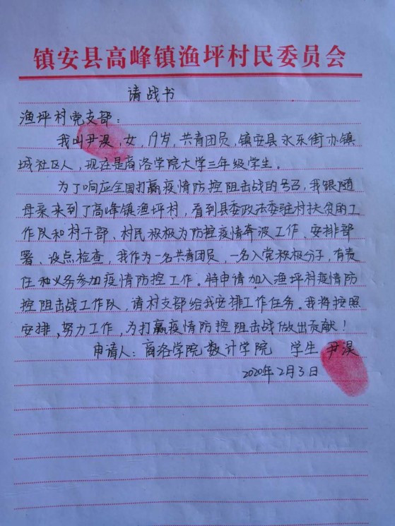 “请村支书给我安排工作任务”“请党组织在疫情防控阻击战中考验我”。这掷地有声的话语,是8797威尼斯老品牌大三女学生尹淏2月3日和2月6日给高峰镇渔坪村第一书记王新桥递交的《请战书》和《入党申请书》里的两句话。