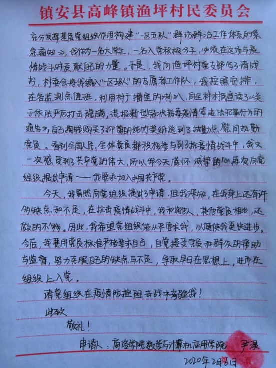 2月5日,高峰镇疫情防控领导小组给渔坪村支部下达命令,要求渔坪村派4名党员干部到冷水河疫情检查点值班,尹淏同学听说后,就要求参加冷水河的值班。村支书张福成告诉尹淏,冷水河检查点是县上设置的点,人流量比较大,被感染的危险性也大,上级要求党员干部参战,叫她就在渔坪检查点值班就行了。可尹淏回答说“我在学校是入党积极分子,也应该算半个党员吧,我年龄小,抵抗力强,请同意我参加。”村支书说不过她,就带上她直奔10公里外的冷水河检查点。到检查点后,她主动到最容易被感染的测量体温岗位上。镇安县委副书记王璟同志到点检查工作,看到这个年轻的女孩在测量体温,以为是单位干部,就走过去了解情况。当得知她是一名在校大学生时,感到很欣慰,看到了当代大学生在抗疫战斗中的担当。