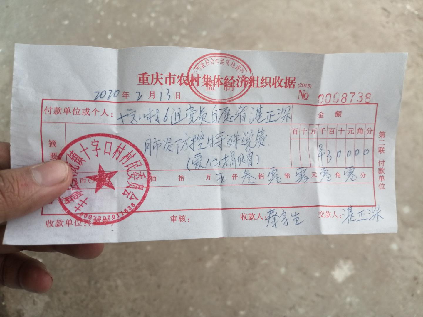 疫情暴发时,湛正深同学正在重庆市丰都县兴龙镇十字口村的老家,对疫情的关注格外用心的他,在得知村党委需要志愿者后,第一时间到所在十字口村村党委报到请战,主动提交请战书。他在请战书中写到:作为一名学生党员,我时刻牢记着随时准备为党和人民牺牲一切的入党誓词,在疫情防控关键的时刻,希望能够参与到疫情防疫第一线,为防范疫情出一份力。同时,湛正深还将自己兼职赚取的三百元现金作为特殊党费上交组织以做疫情防控之用。经过当地党委的批准,湛正深同学加入“抗疫”工作小组,在做好自身安全防护的前提下,迅速投身防控一线。