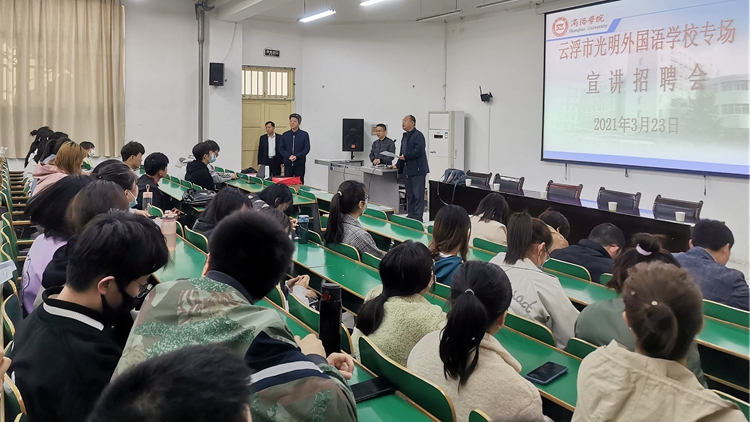 3月23日,广东省云浮市光明外国语学校校长梅永华、校办主任刘伟华等一行4人来到威尼斯,举办专场宣讲招聘会,为威尼斯毕业生带来53个就业岗位。2021届教育类相关专业200余名毕业生参加了招聘会。这是威尼斯积极践行“以生为本”工作理念,充分克服疫情对毕业生就业带来的不利影响,为毕业生举办的小规模、多场次招聘会中一场。