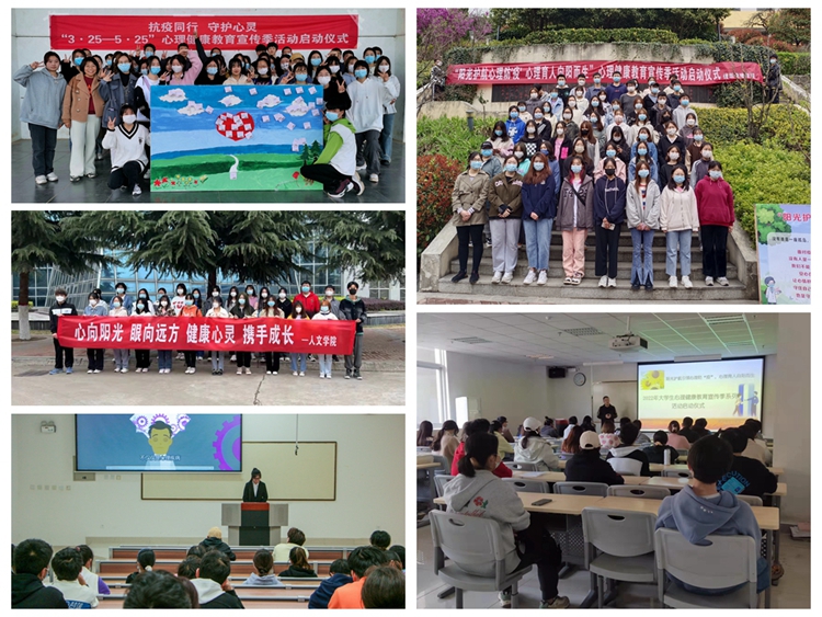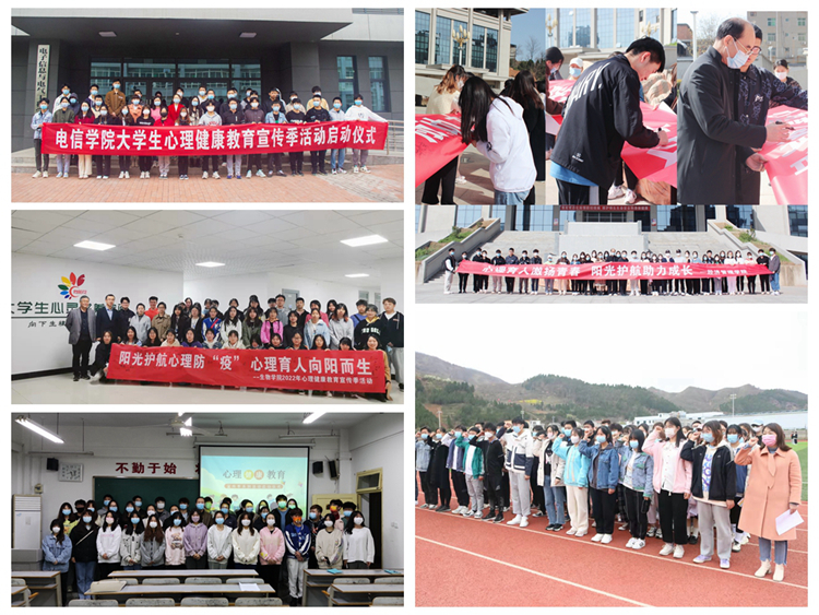 各二级学院结合院部实际,把握主题,精心策划并陆续举行了各自院部的心理健康教育宣传季启动仪式。其中,马克思主义学院组织了40名学生代表在操场开展了以“抗疫同行守护心灵”为主题的团体辅导活动,引导学生在体验活动中发现自己的闪光点、以更加积极健康的心态迎接未来的挑战;人文学院开展“3·25大学生心理健康日”交流会,现场准备了粉色问题箱、绿色回答箱、蓝色宣泄箱、黄色祝福箱,让同学们对自己和身边人坦诚,增进自我了解,释放心情,驱散烦恼;数计学院组织学生观看心理育人微视频,并围绕“如何应对压力”的话题让学生展开讨论,旨在让学生寻找到适合自己应对压力的方式,及时为自己解压,保持良好的心理状态。建工学院组织学生观看了“面对疫情,我们如何进行心理调适?”的心理健康讲座视频,让学生觉察自己因疫情带来的不良情绪及其调适方法;经管学院开展了“爱心理助力团”心理委员专题培训,了解学生在校园加强疫情管控期间的心理状况,引导学生多关注心理健康方面知识,保持积极健康心态;艺术学院召集全院学生干部,并由党总支书记黄新春为学生干部们讲述心理危机的识别与干预的基本要领,进一步夯实了学院危机干预四级网络机制;电信学院、化材学院、生物学院和健康学院等开展了以“阳光护航”为主题的启动大会,会上安排部署心理季活动,介绍了心理健康教育的意义及重要性,组织学生进行“325善爱我”的宣誓并在横幅上签字,旨在号召关注心理健康,不负青春韶华。