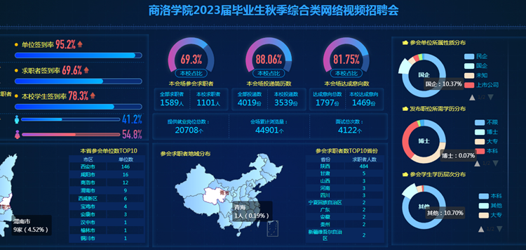 本次网络视频招聘会共有省内外320余家用人单位报名参会,提供涉及制造业、建筑业、房地产业、教育、文化体育和娱乐业、信息传输软件和信息技术服务业、科学研究和技术服务业等10大行业领域的对口、优质就业岗位6200余个。共吸引1589余名校内外毕业生参会,在线访问量达到44901人(次),毕业生累计投递简历4019份。