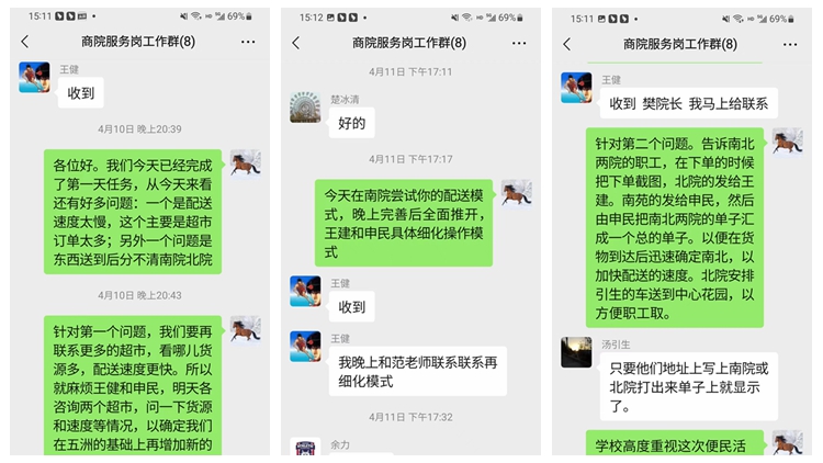 ——多方协调,有序组织。随着商州区陆续出台封控区和管控区外出限制、交通管制等防控措施,通过网络下单采购物资的城区居民越来越多,民生保障超市一度出现下单难、配送难等现象。便民服务队主动与食品、蔬菜和生活用品供应商联系统一采购,根据可供商品种类、教职工日常需要,确定了包括蔬菜、水果、肉蛋类在内的13个套餐,成立专门的采购小组,组建生活物资采购群,通过接龙等方式将大家所需套餐进行登记,安排专人进行套餐统计、分类,再与供应商对接约定配送时间,最后有序分拣发放或送货上门。
