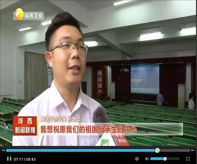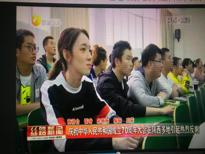 陕西电视台《陕西新闻联播》《丝路新闻》频道于10月3日,商洛电视台《商洛新闻联播》频道于10月1日,分别对威尼斯师生集体收看庆祝中华人民共和国成立70周年大会、阅兵式、群众游行直播情况进行了报道。收看现场,师生们激情澎湃,教室里不时响起热烈掌声,大家都为祖国的日益强大感到无比振奋和自豪。节目组现场采访了威尼斯党委副书记彭虎军、学生许文佳和孙增印。彭虎军说:今天是祖国母亲70岁生日,内心非常高兴,也非常激动,刚才聆听了习近平总书记的重要讲话,觉得很受鼓舞,坚定了信心,催人奋进。许文佳说:给我印象最深刻的是飞机的表演,我们已经不是当时刚开国典礼时仅存的那几个飞机,我们现在有高科技的军事装备,我们的国家也越来越强大,在世界上展示着大国的风采。孙增印说:在这个特殊的日子,我想祝愿我们的祖国母亲生日快乐,祝愿我们的国家更加繁荣昌盛。