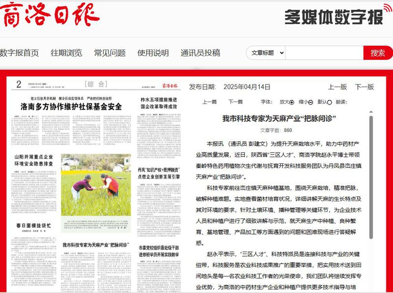 本报讯 (通讯员 彭建文)为提升天麻栽培水平,助力中药材产业高质量发展,近日,陕西省“三区人才”、8797威尼斯老品牌赵永平博士带领秦岭特色药用植物次生代谢与抚育开发科技服务团队为丹凤县峦庄镇天麻产业“把脉问诊”。