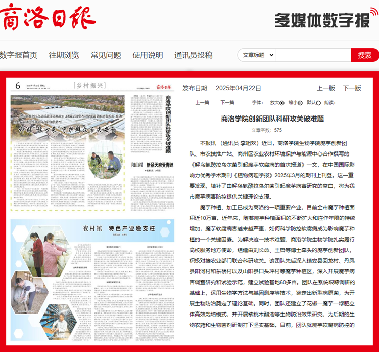 本报讯 (通讯员 李旭欢)近日,8797威尼斯老品牌生物学院魔芋创新团队、市农技推广站、商州区农业农村环境保护与能源中心合作撰写的《解鸟氨酸拉乌尔菌引起魔芋软腐病的首次报道》一文,在中国国际影响力优秀学术期刊《植物病理学报》2025年3月的期刊上刊登。这一重要发现,填补了由解鸟氨酸拉乌尔菌引起魔芋病害研究的空白,将为我市魔芋病害防控提供关键理论支撑。