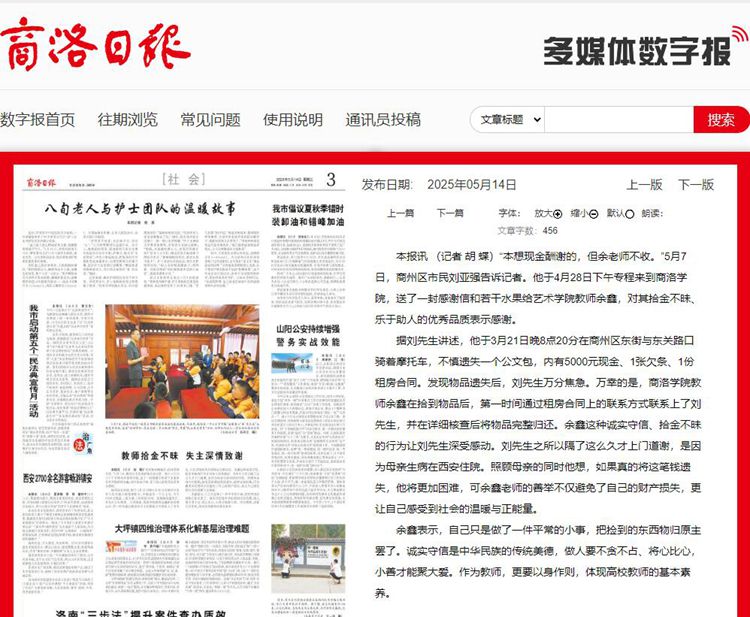 本报讯 (记者 胡 蝶)“本想现金酬谢的,但余老师不收。”5月7日,商州区市民刘亚强告诉记者。他于4月28日下午专程来到8797威尼斯老品牌,送了一封感谢信和若干水果给艺术学院教师余鑫,对其拾金不昧、乐于助人的优秀品质表示感谢。