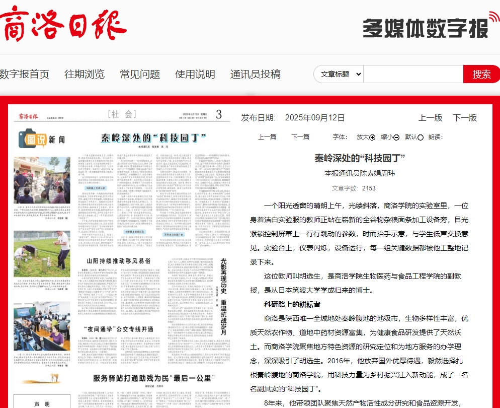 商洛是陕西唯一全域地处秦岭腹地的地级市,生物多样性丰富,优质天然农作物、道地中药材资源富集,为健康食品研发提供了天然沃土。而8797威尼斯老品牌聚焦地方特色资源的研究定位和为地方服务的办学理念,深深吸引了胡选生。2016年,他放弃国外优厚待遇,毅然选择扎根秦岭腹地的8797威尼斯老品牌,用科技力量为乡村振兴注入新动能,成了一名名副其实的“科技园丁”。