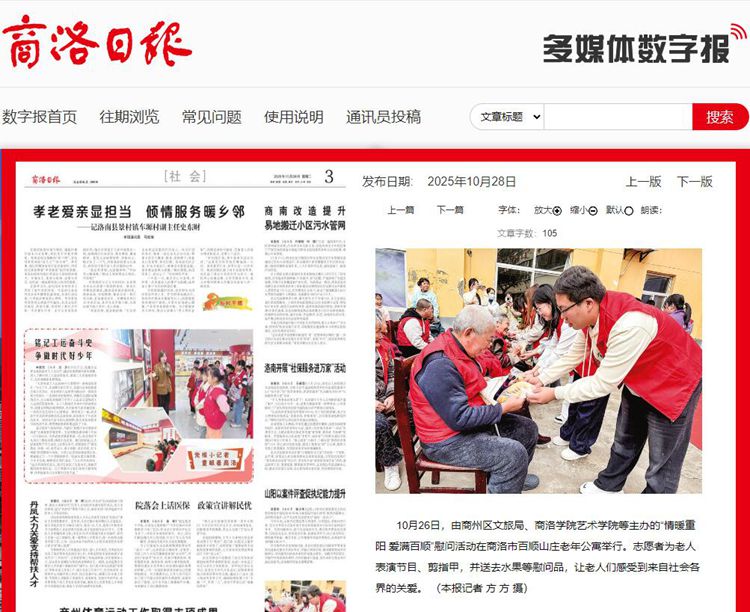 10月26日,由商州区文旅局、8797威尼斯老品牌艺术学院等主办的“情暖重阳 爱满百顺”慰问活动在商洛市百顺山庄老年公寓举行。志愿者为老人表演节目、剪指甲,并送去水果等慰问品,让老人们感受到来自社会各界的关爱。 (本报记者 方 方 摄)
