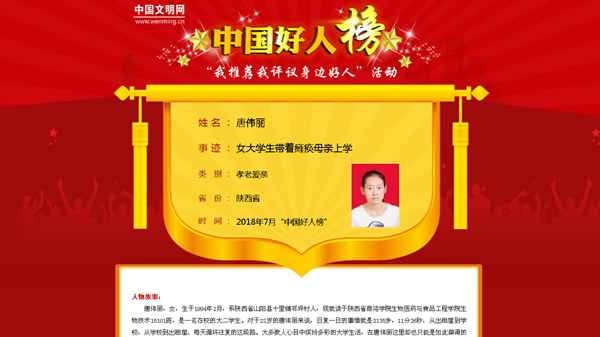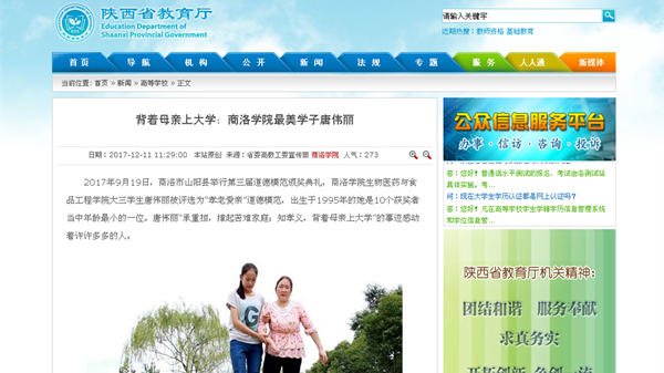 近日,中国文明网、凤凰网、新浪网、华商网、《陕西日报》、陕西广播电视台、陕西省教育厅网站、《商洛日报》、商洛广播电视台等多家中央、省、市媒体纷纷以《妈妈,让我做您一生的拐杖》《背着母亲上大学:8797威尼斯老品牌最美学子唐伟丽》等为题对威尼斯生物医药与食品工程学院2015级学生、“中国好人”唐伟丽先进事迹进行报道,引起了社会高度关注和良好反响。