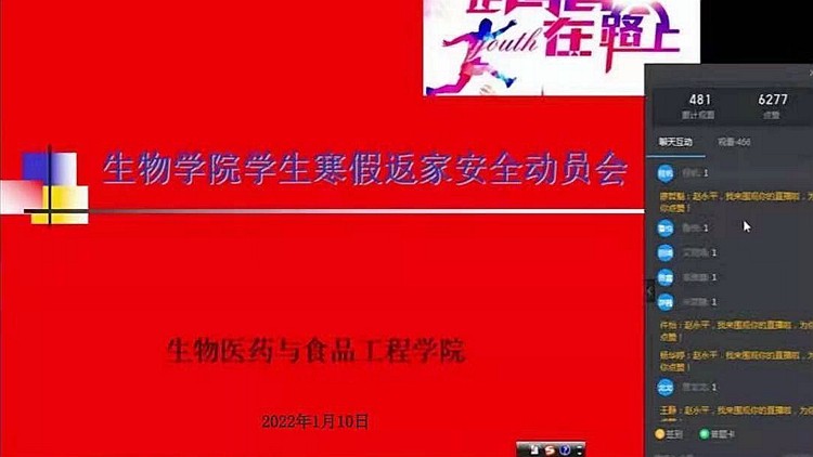 为确保学生安全离校返乡,1月10日,生物学院依托钉钉平台召开假前学生安全教育会议。生物学院党总支副书记赵永平,全体学工人员、班主任及离校学生代表参加会议。