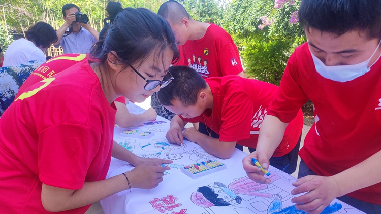 志愿者与智障人士一起开展了公鸡下蛋、赶猪跑、益智套圈、两人三足等趣味项目和彩绘心灵绘画活动。通过活动,为智障人士搭建起沟通桥梁,提高他们对绘画的认识和拓展,激发起他们创造性绘画灵感,多途径、多层面开发他们的潜能。