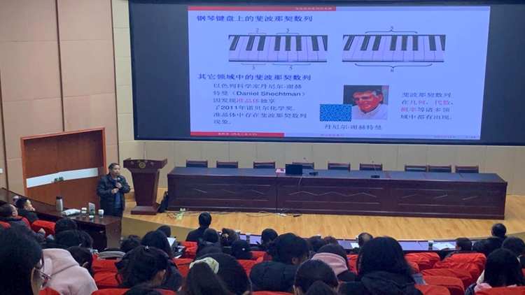 张胜贵教授以《斐波那契数列》为题,从数列的来源、与黄金分割的关系和应用等方面,完整、详细地介绍了斐波那契数列。整场报告深入浅出,与会师生共同体验斐波那契数列的美与价值。