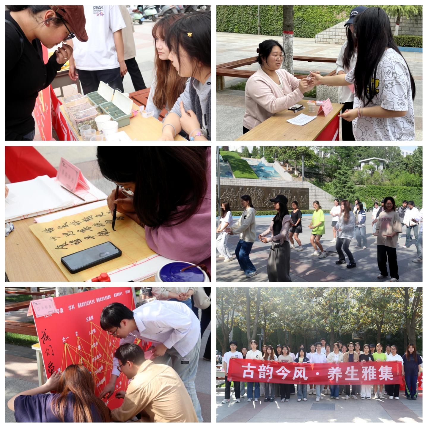 以“古韵流芳”和“本草识真”为主题,师生们互对诗词,赢取文化信物,辨识中药材,了解常见中药材的养生功效,在游戏中感受诗词魅力,在学习中感受中华医学的博大精深。在“丹青逸趣”和“养生功法”环节,师生们挥毫泼墨,康养社学子现场教学“五禽戏”及“八段锦”,在书画创作中修养身心,在刚柔并济的动作中感受古法养生的魅力。