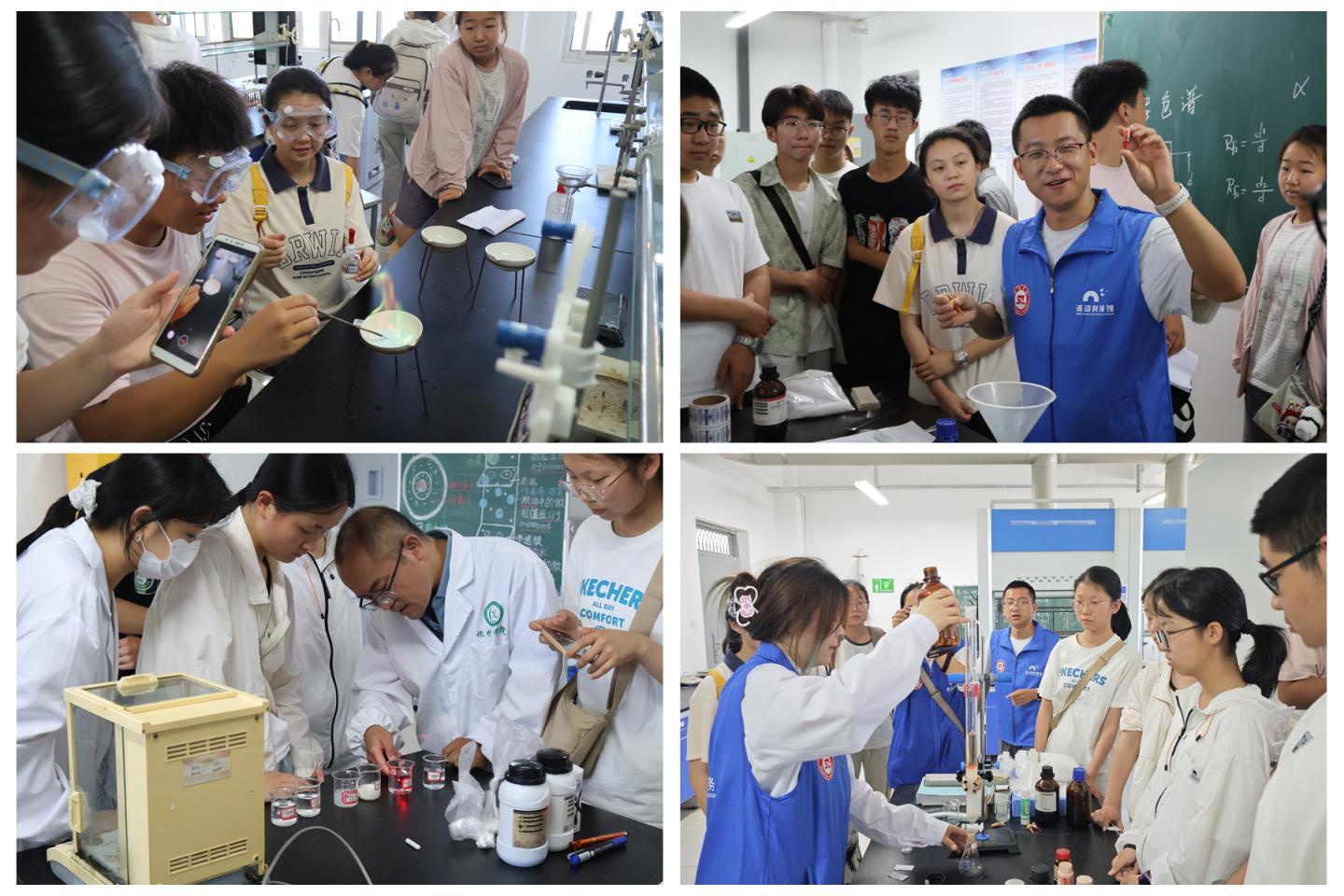 在无机化学实验室,高霞博士以“点亮化学之光 —— 焰色反应实验探秘” 为主题,从原子结构与电子跃迁理论出发,解析钠、钾等金属盐溶液灼烧显色的科学原理,结合矿物分析等生活实例,带领学生领略化学视觉奇观,实验师刘萍指导学生完成实验,辨识不同金属焰色。有机化学实验室中,王以寿博士以 “薄层色谱、柱色谱分离技术 —— 色素的高效分离” 为核心,结合苏丹红检测等科研实例,讲解色谱技术在食品安全等领域的应用,学生在志愿者协助下体验染料分离实验。物理化学实验室内,刘永亮博士以牛奶等生活胶体现象为切入点,指导学生制备胶体,观察丁达尔效应等现象,理解胶体应用价值。化学教学论实验室里,史景涛博士以橙子等为样本,带领学生开展实验,通过果汁对高锰酸钾溶液的还原反应,探究维生素 C 还原性及酸度影响,搭建学科认知桥梁。