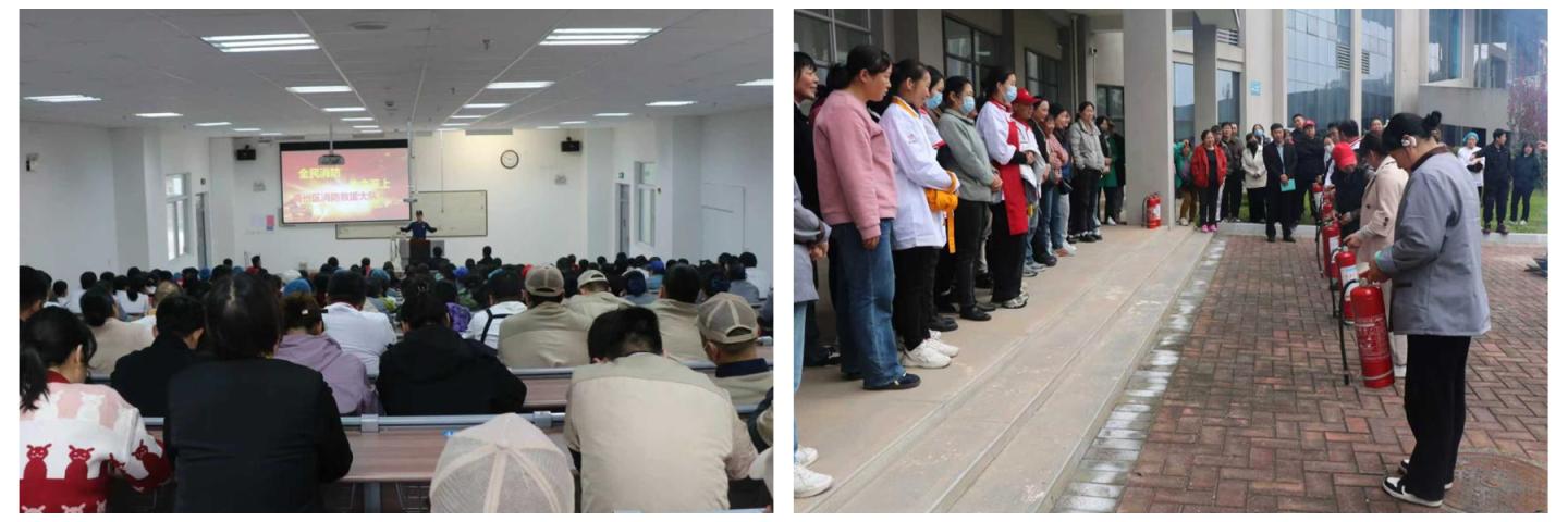 为进一步增强后勤从业人员的消防安全意识,掌握基本的防火、灭火及自救逃生技能,切实提高从业人员的应急处置能力,有效预防和减少火灾事故的发生,10月29日,后勤保障处邀请商州区消防站站长陈超开展了消防安全知识培训和实操演练,各公寓楼宿管员、食堂从业人员、超市和快递驿站服务人员共计210余人参加了知识培训,并在8号教学楼前组织开展了灭火实战演练活动。