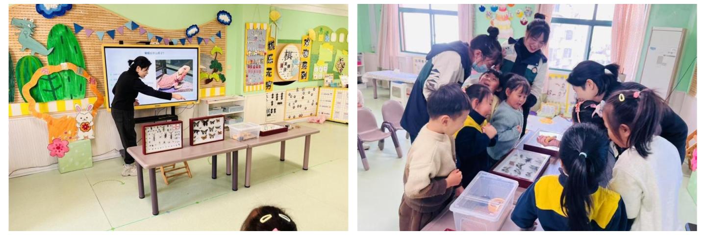 活动中,李丽以“神秘的爬行动物”为切入点,通过生动的语言和直观的现场展示,向小朋友们介绍了蜥蜴的外形特征、生活习性和生存本领。在昆虫认知环节,李丽现场展示了包括蝴蝶、甲虫、蜻蜓等多种昆虫标本,并引导小朋友们观察标本形态、解答相关问题。小朋友们认真观察标本、分享感受,现场互动氛围热烈。